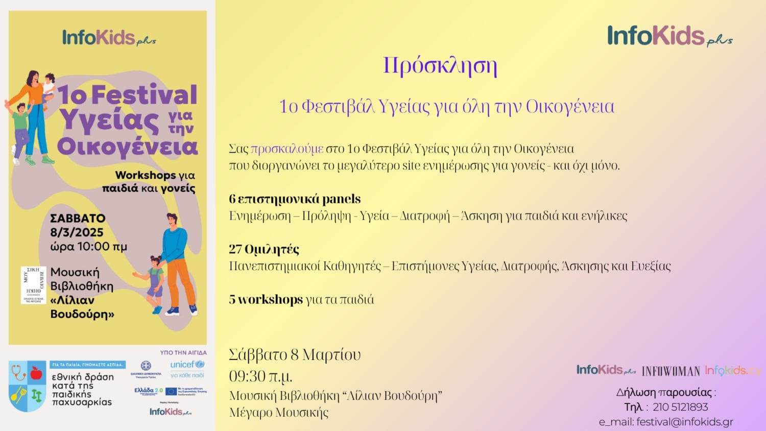 Με τη συμμετοχή έγκριτων επιστημόνων και εκπροσώπων Ιατρικών Εταιρειών, το 1ο Φεστιβάλ Υγείας για την Οικογένεια από το Infokids.gr εγκαινιάζει έναν θεσμό που έλειπε από τη χώρα μας.