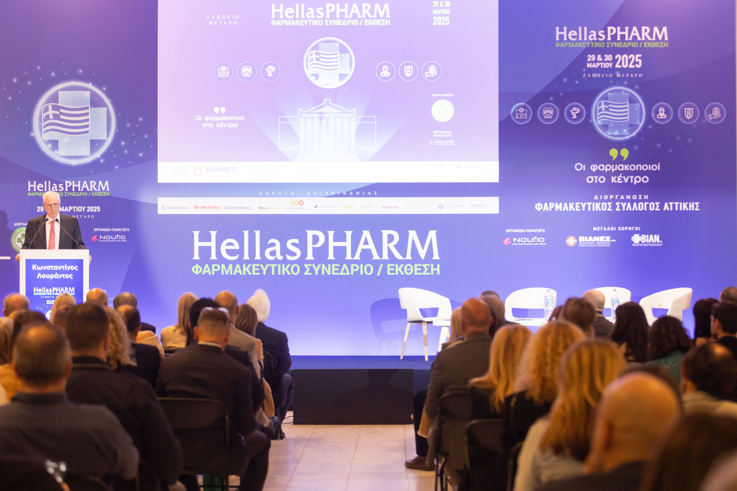 Κατά τη διάρκεια της επίσημης έναρξης του Hellas PHARM 2025, πραγματοποιήθηκε η κεντρική ομιλία του προέδρου του Φαρμακευτικού Συλλόγου Αττικής κ. Κωνσταντίνου Λουράντου με θέμα «Αν η υγεία είναι προϊόν, που χωράει ο άνθρωπος;», ενώ χαιρετισμό απηύθυναν o Υπουργός Υγείας Άδωνις Γεωργιάδης, με βιντεοσκοπημένο μήνυμα που απέστειλε, ο πρόεδρος του Ελληνικού Ερυθρού Σταυρού Dr. Αντώνιος Αυγερινός, η Διοικήτρια του ΕΟΠΥΥ Θεανώ Καρποδίνη, ο πρόεδρος του ΣΦΕΕ Ολύμπιος Παπαδημητρίου, ο πρόεδρος της ΠΕΦ Θεόδωρος Τρύφων, ο πρόεδρος του Συνδέσμου ΕΦΕΧ Γρηγόρης Καρέλος, ο πρόεδρος της ΟΣΦΕ Βασίλης Μπιρλιράκης.