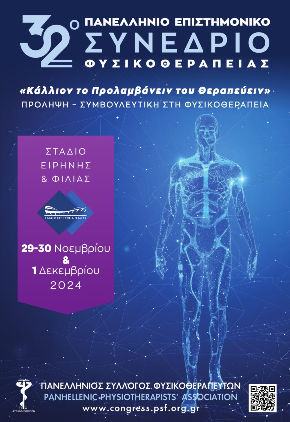 Το φετινό 32ο Πανελλήνιο Επιστημονικό Συνέδριο της Φυσικοθεραπείας, ο μεγαλύτερος ετήσιος θεσμός επιστημονικού διαλόγου των Φυσικοθεραπευτών με την Πολιτεία και τους εταίρους υγείας, θα λάβει χώρα από την Παρασκευή 29 Νοεμβρίου έως και την Κυριακή 1 Δεκεμβρίου 2024, στο Στάδιο Ειρήνης και Φιλίας, υπό την αιγίδα του Υπουργείου Υγείας.