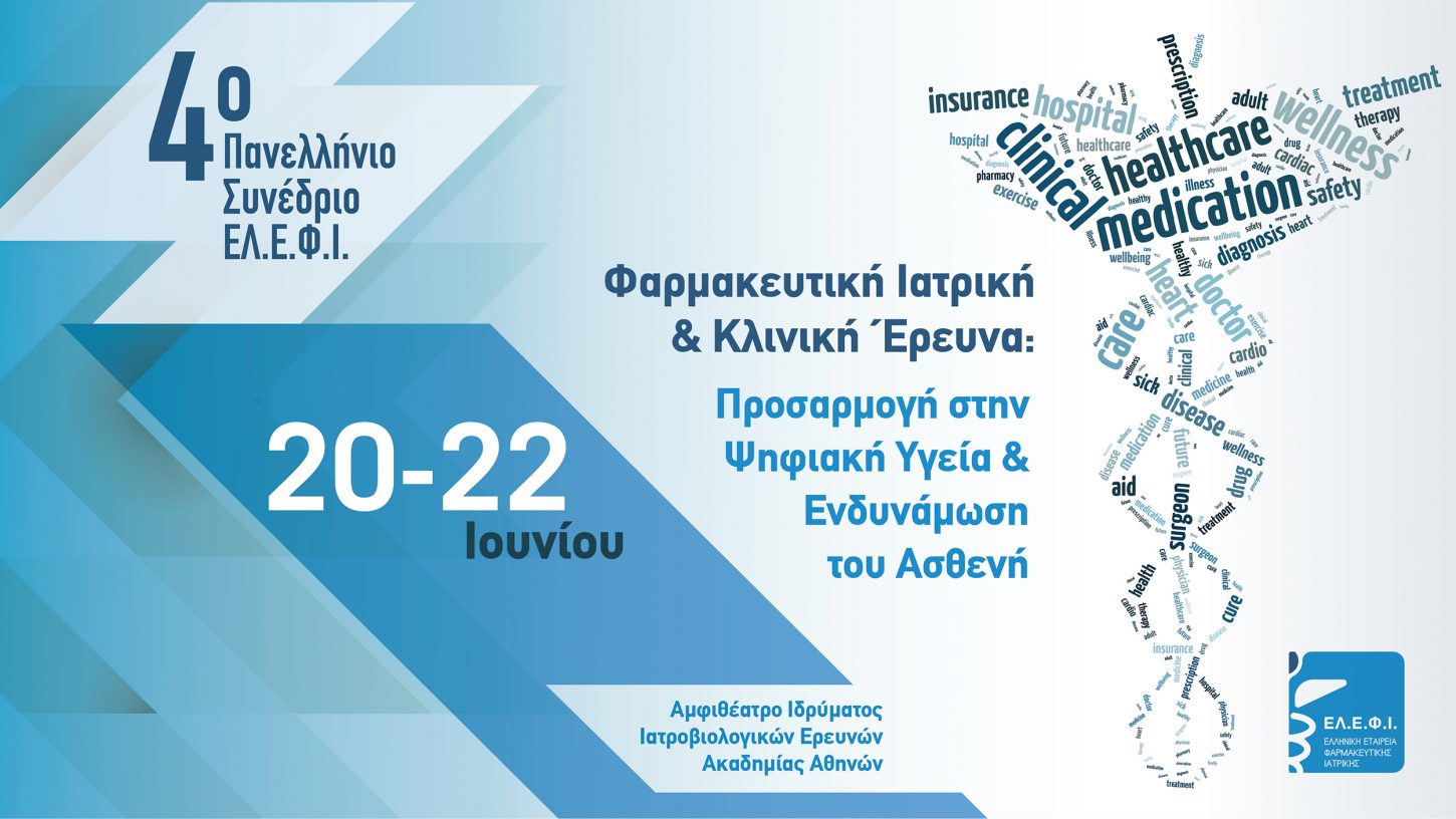 Με εξαιρετική επιτυχία ολοκληρώθηκαν οι τριήμερες εργασίες του 4ου Πανελλήνιου Συνεδρίου της Ελληνικής Εταιρείας Φαρμακευτικής Ιατρικής (ΕΛ.Ε.Φ.Ι.), με τίτλο «Φαρμακευτική Ιατρική & Κλινική Έρευνα στον 21ο αιώνα: Προσαρμογή στην Ψηφιακή Υγεία και Ενδυνάμωση του Ασθενή», το οποίο διεξήχθη στις 20 – 22 Ιουνίου 2019 στο Ίδρυμα Ιατροβιολογικών Ερευνών της Ακαδημίας Αθηνών (ΙΙΒΕΑΑ).