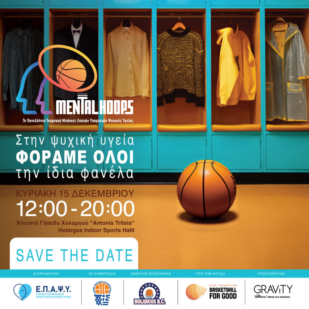 Η Εταιρεία Περιφερειακής Ανάπτυξης και Ψυχικής Υγείας (ΕΠΑΨΥ) διοργανώνει το 7ο Πανελλήνιο Τουρνουά Μπάσκετ “Mental Hoops”, την Κυριακή 15 Δεκεμβρίου 2024 και ώρα 12:00-20:00, στο Κλειστό Γυμναστήριο Χολαργού.
