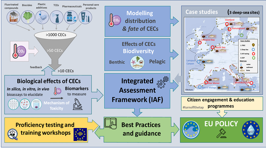 Το Ινστιτούτο Ωκεανογραφίας θα αναπτύξει και θα υλοποιήσει ένα Ολοκληρωμένο Πλαίσιο Αξιολόγησης και Παρακολούθησης (IAF) ρύπων αναδυόμενης ανησυχίας. Στον Ελληνικό χώρο, οι ρύποι με αναδυόμενη ανησυχία θα μελετηθούν στον Σαρωνικό κόλπο, ενώ για την επίδραση της κλιματικής αλλαγής στη βιοδιαθεσιμότητα και τοξικότητά τους, θα χρησιμοποιηθούν οι παράμετροι της κλιματικής αλλαγής που παρακολουθούνται τις τελευταίες δεκαετίες στον σταθμό συνεχούς παρακολούθησης του ΕΛΚΕΘΕ που βρίσκεται στο κρητικό πέλαγος.