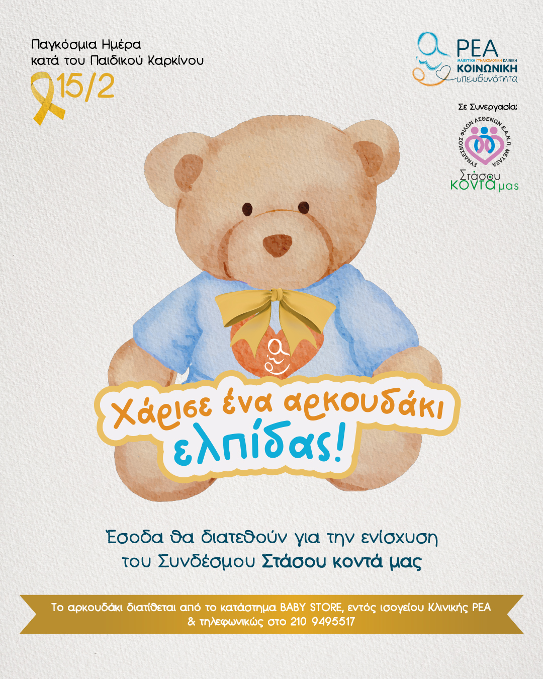 Η Κλινική ΡΕΑ με αφορμή την Παγκόσμια Ημέρα κατά του Παιδικού Καρκίνου (15 Φεβρουαρίου), στηρίζει τη μάχη κατά του καρκίνου με μια ξεχωριστή πρωτοβουλία. Από τις 11 Φεβρουαρίου 2025 και για όλο τον Φεβρουάριο, αρκουδάκια ελπίδας με κονκάρδα ευαισθητοποίησης για τον παιδικό καρκίνο θα διατίθενται από το κατάστημα BABY STORE, που βρίσκεται εντός του ισογείου της Κλινικής ΡΕΑ.