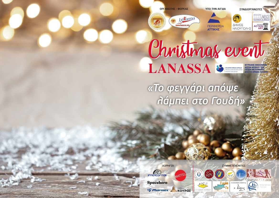 Το φιλανθρωπικό σωματείο ΛΑΝΑΣΣΑ, υπέρ παιδιών με καρκίνο (www.lanassa.org) σε συνεργασία με το «ΟΡΑΜΑ ΕΛΠΙΔΑΣ», τα Εκπαιδευτήρια «Η Θεομήτωρ» και το Σύλλογο Ατόμων με σκλήρυνση κατά πλάκας Αττικής, σας προσκαλεί στην Χριστουγεννιάτικη εορτή του που συνδιοργανώνει με το Δήμο Ηλιούπολης, την UNESCO Πειραιώς & Νήσων και την Action Art International, τη Δευτέρα 16 Δεκεμβρίου 2024 στις 17:30 στο Δημοτικό Θέατρο Ηλιούπολης ”Μίκης Θεοδωράκης”