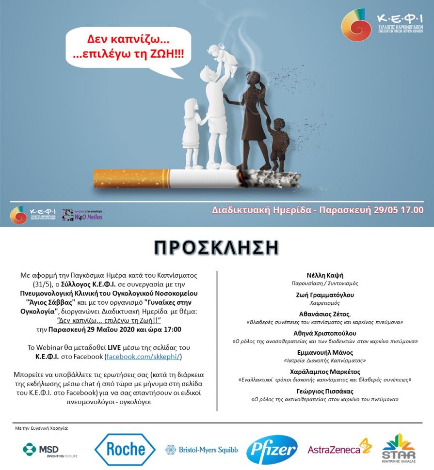 Με αφορμή την Παγκόσμια Ημέρα κατά του Καπνίσματος, ο Σύλλογος Καρκινοπαθών – Εθελοντών – Φίλων – Ιατρών Κ.Ε.Φ.Ι. Αθηνών διοργανώνει διαδικτυακή ημερίδα με θέμα «Δεν καπνίζω… επιλέγω τη ΖΩΗ», στο πλαίσιο της αντικαπνιστικής εκστρατείας ενημέρωσης για τον καρκίνο του πνεύμονα, την Παρασκευή 29 Μαΐου 2020 και ώρα 17:00. H ημερίδα θα μεταδοθεί απευθείας μέσω της σελίδας του Κ.Ε.Φ.Ι. στο Facebook (facebook.com/skkephi/) και μαγνητοσκοπημένη από το κανάλι STAR Κεντρικής Ελλάδας την Κυριακή 31 Μαΐου.