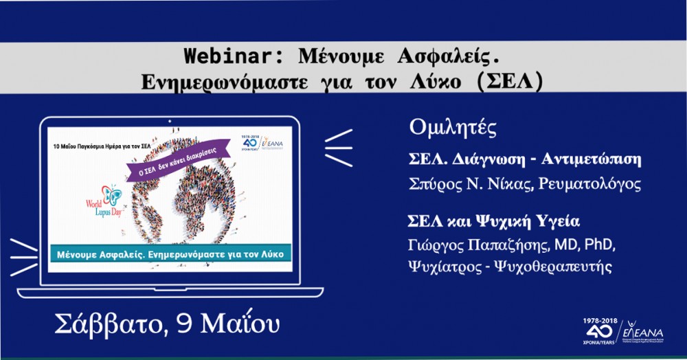 Με οδηγό τις ανάγκες των ασθενών και των οικογενειών τους σε συναισθηματικό και πρακτικό επίπεδο και στα πλαίσια της ευθύνης της για έγκυρη ενημέρωση, η Ελληνική Εταιρεία Αντιρευματικού Αγώνα θα αναρτήσει από το πρωί του Σαββάτου, στη σελίδα της στο fb και στο YouTube, ενημερωτικό σεμινάριο (webinar) με θέμα «Μένουμε Ασφαλείς. Ενημερωνόμαστε για τον Συστηματικό Ερυθηματώδη Λύκο (ΣΕΛ).»