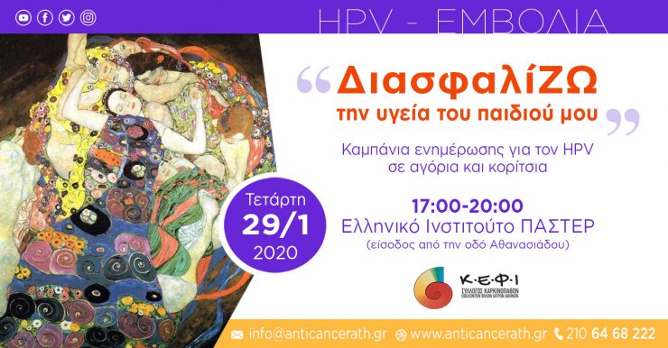 Ο Σύλλογος Καρκινοπαθών- Εθελοντών- Φίλων- Ιατρών Κ.Ε.Φ.Ι. Αθηνών, σε μία ακόμη προσπάθεια για την ενημέρωση των πολιτών για τον ιό HPV, επιθυμεί να επικεντρωθεί μεταξύ άλλων και στην ενημέρωση των γονέων και το ρόλο του εμβολιασμού, σε κορίτσια και αγόρια. Για το λόγο αυτό διοργανώνει Ημερίδα ενημέρωσης, την Τετάρτη 29 Ιανουαρίου 2020 και ώρα 17:00-21:00, στο χώρο του Ελληνικού Ινστιτούτου ΠΑΣΤΕΡ (Είσοδος στο Αμφιθέατρο από την οδό Αθανασιάδου).
