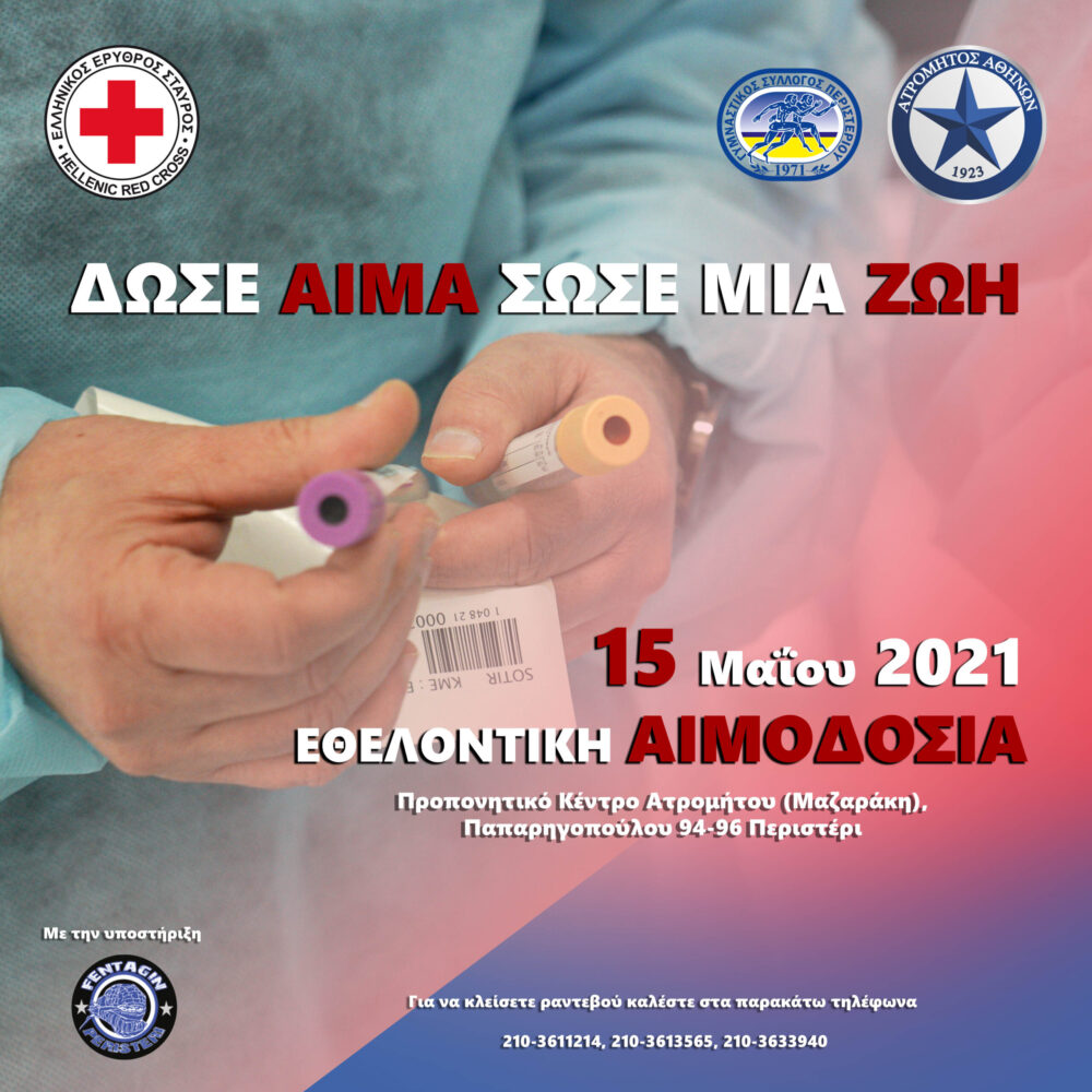 Μεγάλη εθελοντική αιμοδοσία συνδιοργανώνουν ο Ελληνικός Ερυθρός Σταυρός και η ΠΑΕ Ατρόμητος το Σάββατο 15 Μάϊου 2021 στο Προπονητικό Κέντρο Ατρομήτου (Μαζαράκη), και ώρες 08:30-15:00, στοχεύοντας στην ενίσχυση των συμπολιτών μας που χρειάζονται άμεσα αίμα, ιδιαίτερα σε μία περίοδο που οι ανάγκες λόγω της πανδημίας είναι τεράστιες.