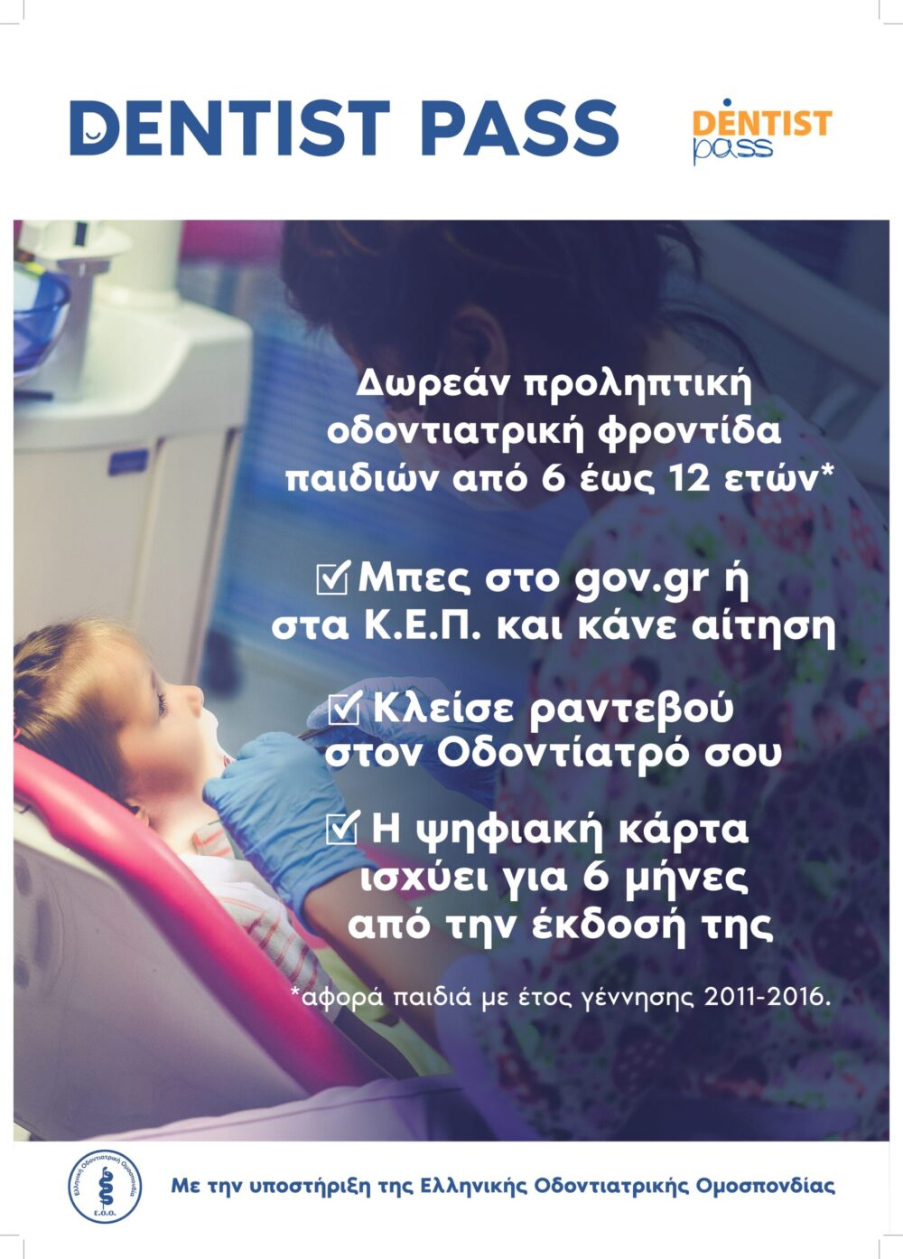 Με χρηματοδότηση από το Ταμείο Ανάκαμψης και την υποστήριξη της Ελληνικής Οδοντιατρικής Ομοσπονδίας, αλλά και προσφοράς των χιλιάδων Οδοντιάτρων της χώρας μας, υποδεχόμαστε για πρώτη φορά ένα προληπτικό πακέτο οδοντιατρικής φροντίδας, το «Dentist pass». Ξεκάθαρος στόχος για την οδοντιατρική κοινότητα, είναι το προσφερόμενο προληπτικό πρόγραμμα Dentist pass, έστω και με την μορφή voucher, να στεφθεί με επιτυχία οδηγώντας χιλιάδες παιδιά στον Οδοντίατρο.