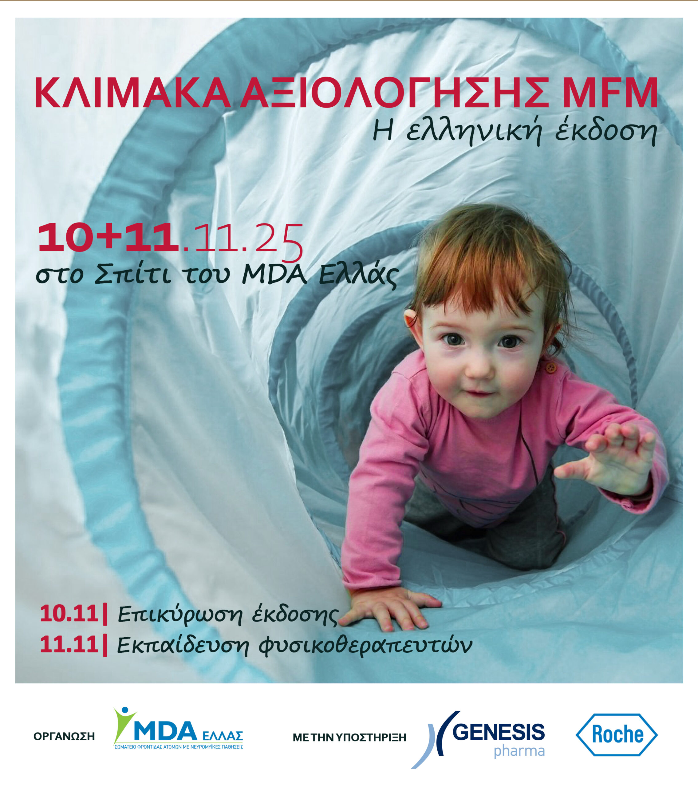 Το MDA Ελλάς, Σωματείο για τη Φροντίδα ατόμων με νευρομυικές παθήσεις διοργανώνει σεμινάριο με σκοπό την επικύρωση, την ολοκλήρωση και την εκπαίδευση στην ελληνική μετάφραση της κλίμακας αξιολόγησης Motor Function Measure (MFM) για παιδιά με νευρομυικές παθήσεις που εκπονήθηκε από το τμήμα φυσικοθεραπείας του Πανεπιστημιακού Γενικού Νοσοκομείου «Αττικόν» και σε συνεργασία με το αντίστοιχο τμήμα του Πανεπιστημίου της Lyon.