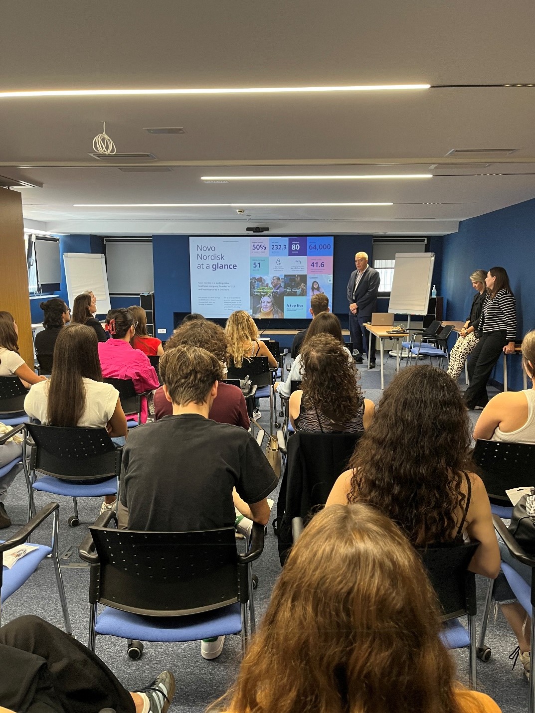 Κατά τη διάρκεια της επίσκεψης, οι φοιτητές είχαν την ευκαιρία να γνωρίσουν τη μακρά ιστορία και εξέλιξη της εταιρείας, και να ενημερωθούν εκτενώς για τη δομή, την κουλτούρα και τις ευκαιρίες καριέρας που προσφέρει η Novo Nordisk Hellas. Μέσα από στοχευμένες παρουσιάσεις, αναλύθηκαν διεξοδικά οι λειτουργίες των επιμέρους τμημάτων, ανοίγοντας έναν εποικοδομητικό διάλογο γύρω από τις εξελίξεις και τις προοπτικές του φαρμακευτικού κλάδου. Οι φοιτητές επέδειξαν ιδιαίτερο ενδιαφέρον, συμμετέχοντας ενεργά στις συζητήσεις και θέτοντας ουσιαστικά ερωτήματα από τις εξελίξεις του φαρμακευτικού κλάδου και τις επαγγελματικές ευκαιρίες.