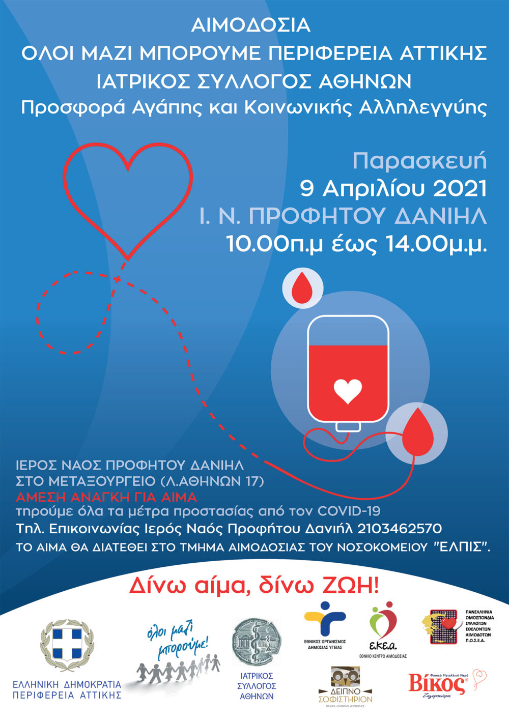 Η Περιφέρεια Αττικής σε συνεργασία με το «Όλοι Μαζί Μπορούμε» τον ΙΣΑ και τον Ιερό Ναό Προφήτου Δανιήλ, διοργανώνουν αύριο Παρασκευή 9 Απριλίου δράση Εθελοντικής Αιμοδοσίας για τη στήριξη των αναγκών του Νοσοκομείου «ΕΛΠΙΣ».