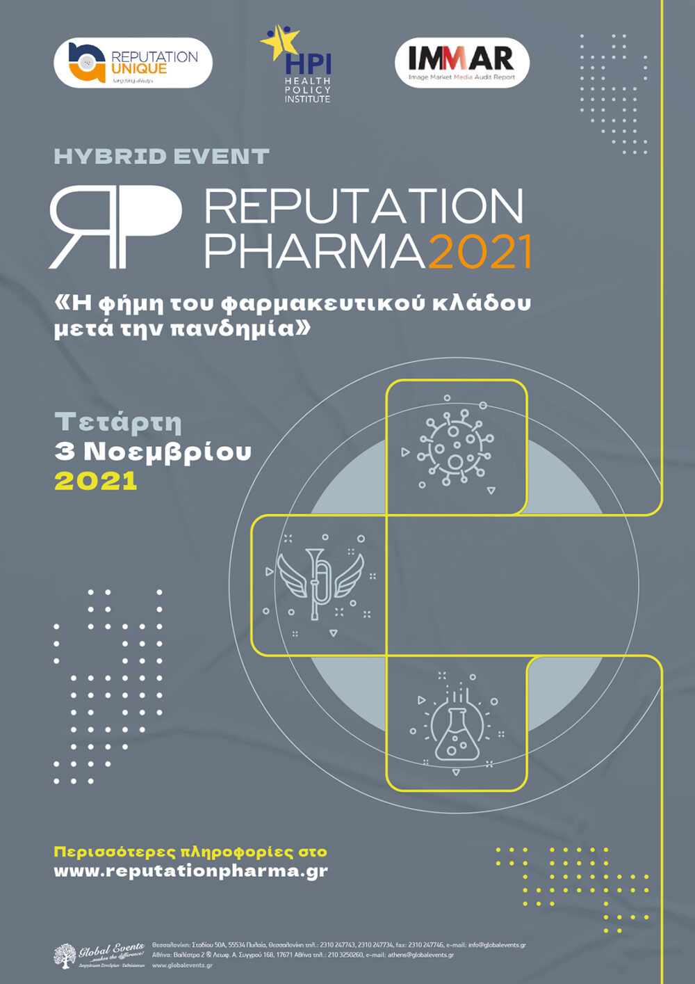 Το Ινστιτούτο Πολιτικής Υγείας και η Reputation Unique διοργανώνουν για 2η φορά την Ημερίδα Reputation Pharma. H ημερίδα με κεντρικό θέμα «Η φήμη του φαρμακευτικού κλάδου μετά την πανδημία», θα έχει φέτος υβριδικό χαρακτήρα και θα πραγματοποιηθεί την Τετάρτη 3 Νοεμβρίου 2021.