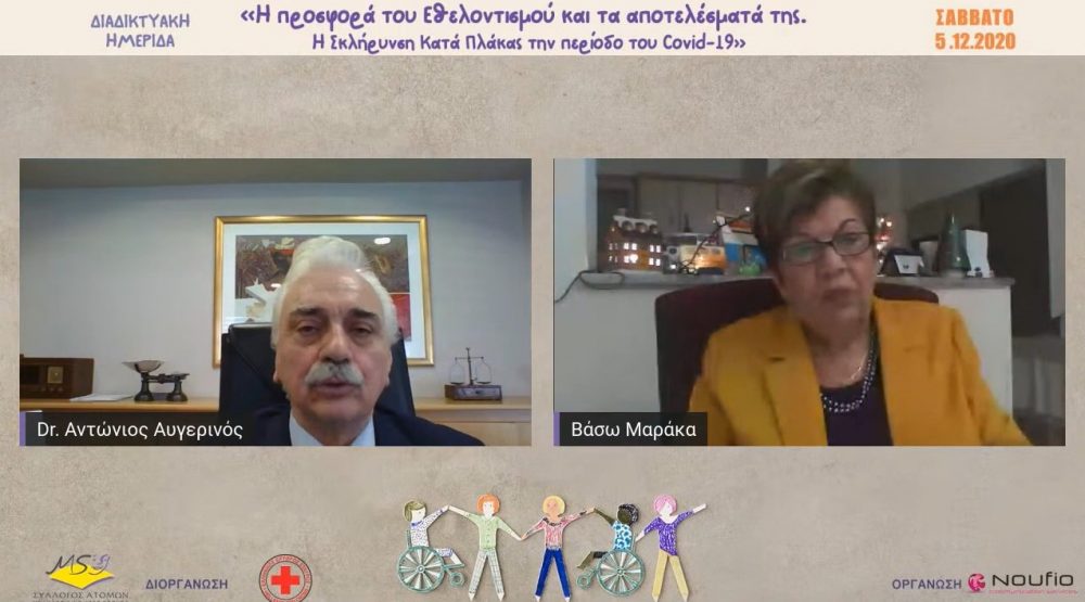 Την ημερίδα άνοιξε με χαιρετισμό του ο πρόεδρος του Ελληνικού Ερυθρού Σταυρού Dr. Αντώνιος Αυγερινός «Χαιρετίζω με ιδιαίτερη χαρά και ικανοποίηση τη σημερινή μας διαδικτυακή ημερίδα με θέμα “Η προσφορά του Εθελοντισμού και τα αποτελέσματά της. Η Σκλήρυνση Κατά Πλάκας την περίοδο του Covid-19”. Η χαρά και η ικανοποίησή μου εδράζονται στη βαθιά μου πεποίθηση ότι η αμοιβαία ενημέρωση, η ανταλλαγή απόψεων και πείρας, και η παρουσίαση βασικών και ευαίσθητων κοινωνικών θεμάτων, είναι πλέον επιτακτική ανάγκη στο πλαίσιο της διεθνώς επιταχυνόμενης κίνησης του κλάδου των Επιστημών Υγείας. Άλλωστε η εξέλιξη των Επιστημών Υγείας και ο κρίσιμος επιμερισμός τους, τόσο στον χώρο της έρευνας όσο και στην καθ’ ημέραν πράξη, καθιστούν την ημερίδα μας όχι μόνο απαραίτητη αλλά και άκρως επίκαιρη.