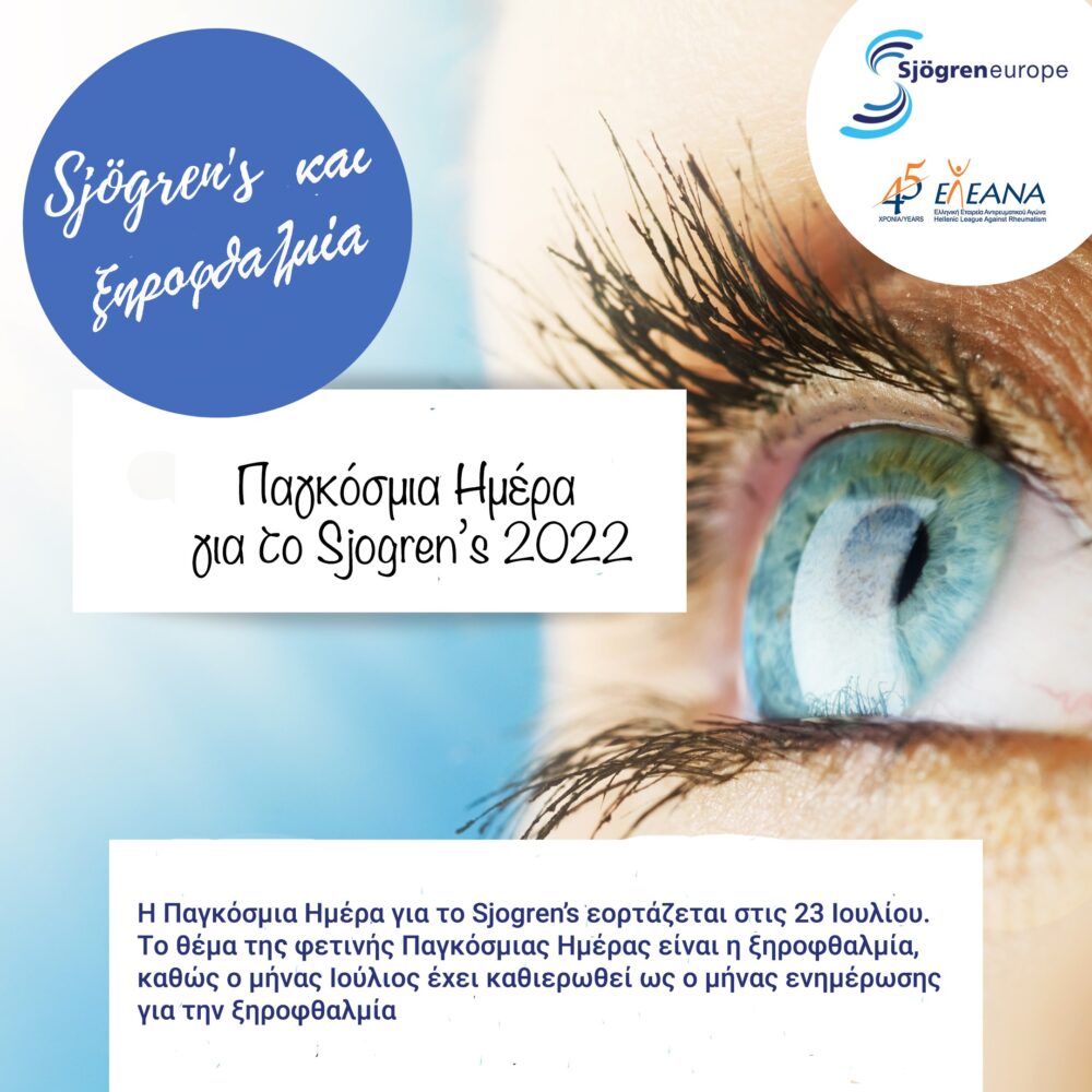 Με αφορμή τον εορτασμό  της Παγκόσμιας Ημέρας για το Sjögren’s,  η Ελληνική Εταιρεία  Αντιρευματικού Αγώνα και η SJÖGREN EUROPE (Ευρωπαϊκή Ομοσπονδία Συλλόγων Ασθενών με Sjögren’s) τονίζουν ότι η ξηροφθαλμία, που ταλαιπωρεί περίπου 95% των ασθενών,   εξακολουθεί να υποδιαγιγνώσκεται και να υποθεραπεύεται.