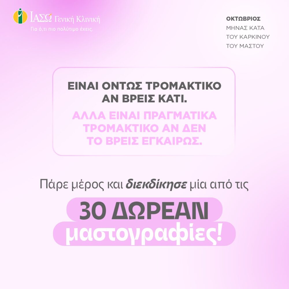 H Γενική Κλινική του ΙΑΣΩ με αφορμή τον μήνα ενημέρωσης και ευαισθητοποίησης για τον Καρκίνο του Μαστού και μήνυμα «Είναι όντως τρομακτικό αν βρεις κάτι. Αλλά είναι πραγματικά τρομακτικό αν δεν τον βρεις εγκαίρως.», παροτρύνει τις γυναίκες να κάνουν την αυτοεξέταση συνήθεια και να μην παραλείπουν τον ετήσιο έλεγχο, προσφέροντας 30 δωρεάν Ψηφιακές Μαστογραφίες, με διαγωνισμό στις σελίδες του στο Facebook και στο Instagram.