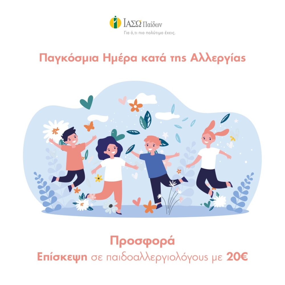 Με αφορμή την Παγκόσμια Ημέρα κατά της Αλλεργίας (8 Ιουλίου), το ΙΑΣΩ Παίδων προσφέρει επίσκεψη σε Παιδοαλλεργιολόγους στην προνομιακή τιμή των 20€. Η προσφορά ισχύει για όσους επικοινωνήσουν στα τηλέφωνα 210 6383070–2 (Δευτέρα-Παρασκευή, 09:00-17:00) και προγραμματίσουν το ραντεβού τους μέχρι και την Παρασκευή 22 Ιουλίου 2022.
