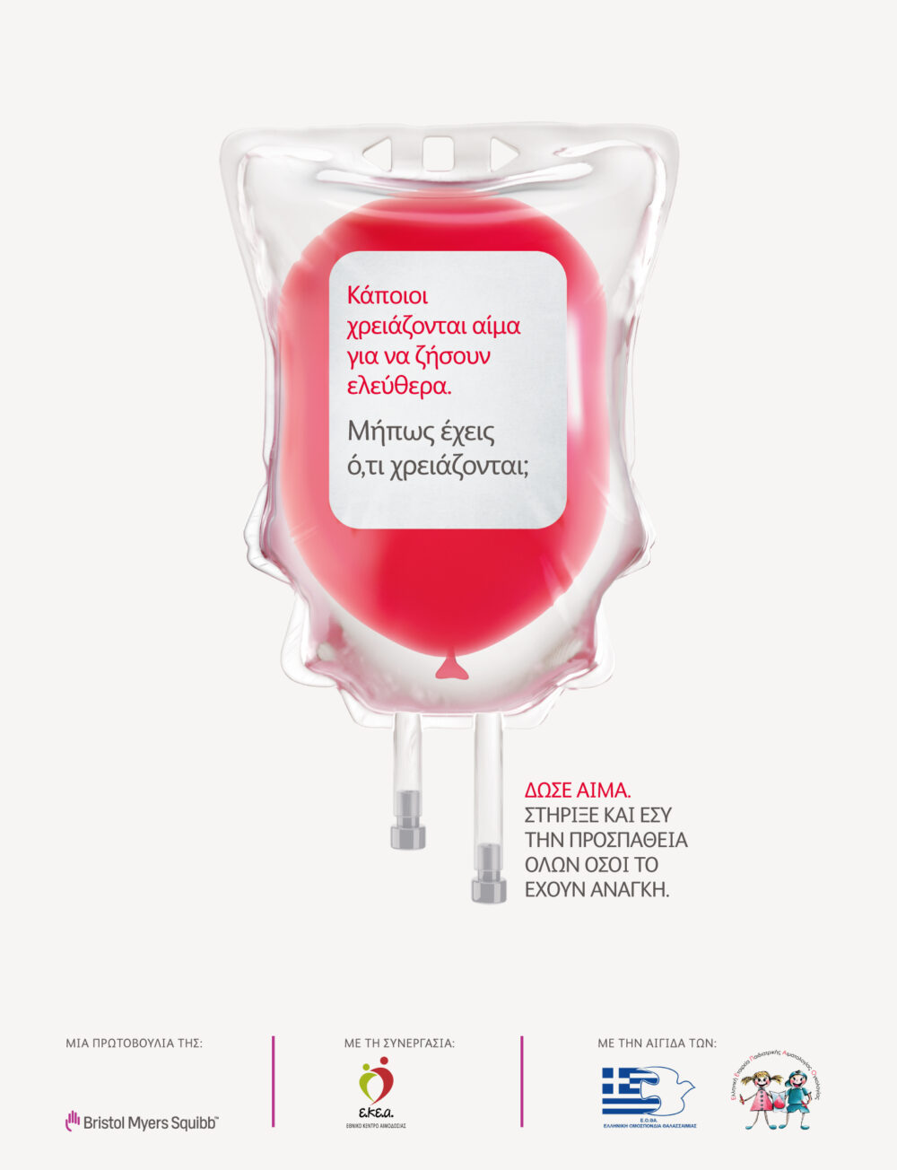 Αυτή είναι η κεντρική ιδέα πίσω από την καμπάνια «Κάποιοι χρειάζονται αίμα. Μήπως έχεις ό,τι χρειάζονται;» που υλοποιεί η βιοφαρμακευτική εταιρεία Bristol Myers Squibb σε συνεργασία με το Εθνικό Κέντρο Αιμοδοσίας (ΕΚΕΑ), υπό την αιγίδα της Ελληνικής Ομοσπονδίας Θαλασσαιμίας (ΕΟΘΑ) και της Ελληνικής Εταιρείας Παιδιατρικής Αιματολογίας-Ογκολογίας (ΕΕΠΑΟ). Την καμπάνια υποστηρίζει ως Πρέσβειρα η δημοσιογράφος και παρουσιάστρια, Ελεονώρα Μελέτη.