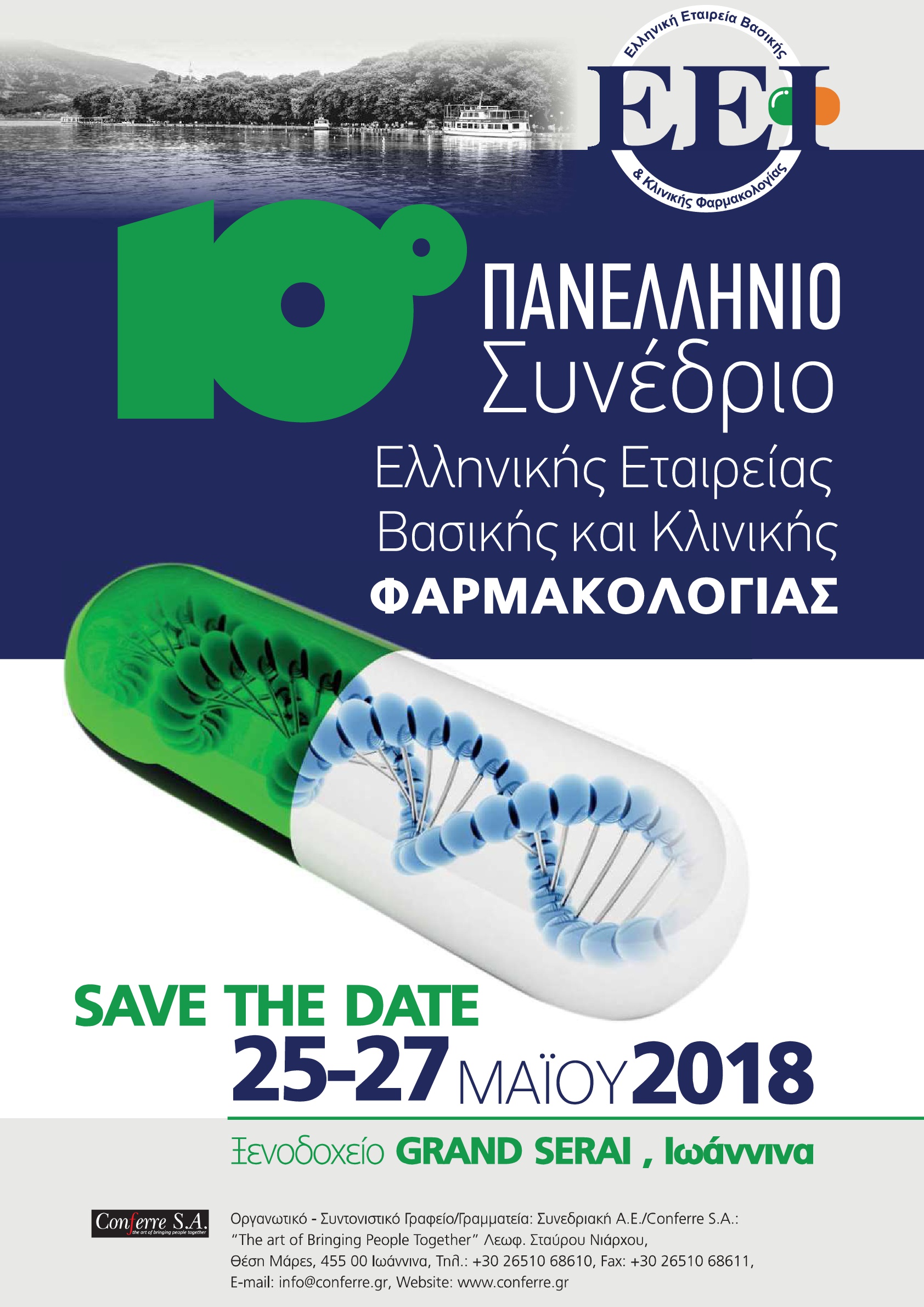 Το 10ο Πανελλήνιο Συνέδριο Βασικής και Κλινικής Φαρμακολογίας, θα πραγματοποιηθεί στα Ιωάννινα και συγκεκριμένα, στο ξενοδοχείο «Grand Serai» από 25 έως 27 Μαΐου 2018. Κατά τη διάρκεια αυτής της Επιστημονικής Εκδήλωσης, κορυφαίοι φαρμακολόγοι με παγκόσμια ακτινοβολία, θα παρουσιάσουν τις ερευνητικές τους εργασίες σε θέματα καθημερινής ορθής πρακτικής και επερχόμενης καινοτομίας στον τομέα του φαρμάκου.