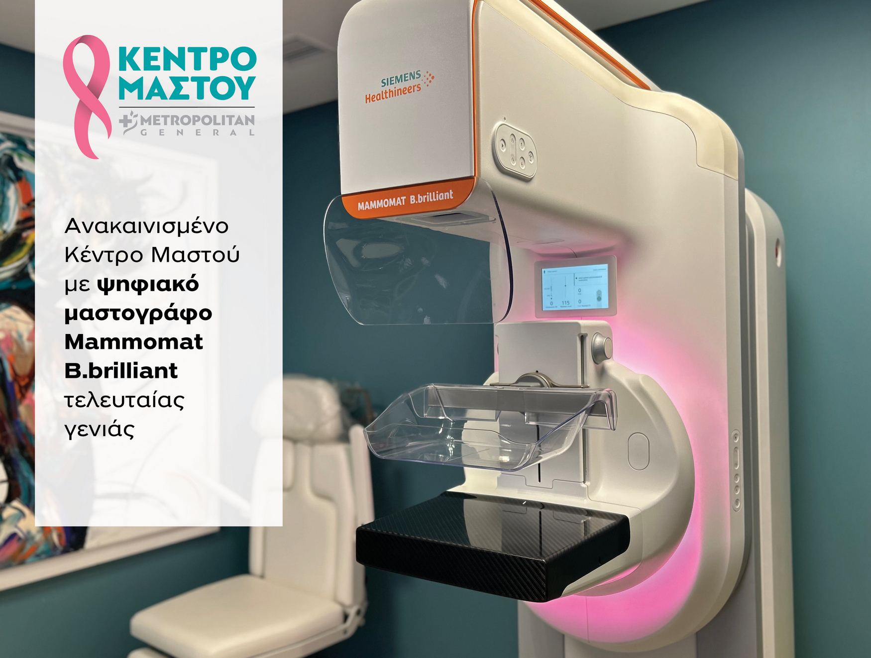 Σε μια ακόμη ανανέωση των υποδομών του προχώρησε το θεραπευτήριο Metropolitan General, μέλος του Hellenic Healthcare Group, με την ανακαίνιση του Κέντρου Μαστού του. Στο νέο, διευρυμένο και μοντέρνας αισθητικής χώρο, εγκαταστάθηκε υπερσύγχρονο σύστημα ψηφιακής μαστογραφίας και υπερηχοτομογράφος υψηλής ευκρίνειας, ισχυρά εργαλεία στα χέρια των έμπειρων ακτινοδιαγνωστών του Κέντρου, που ενισχύουν τη διαγνωστική ακρίβεια.