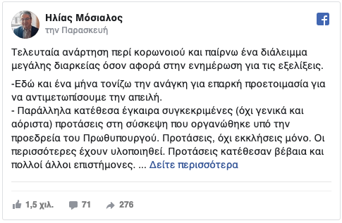 Στην ανάρτηση του στο Facebook ο κ. Μόσιαλος επισημαίνει «Είπα ότι τώρα προέχει η προστασία της δημόσιας υγείας και όχι η περαιτέρω μείωση των φόρων. Αυτό δυσαρέστησε πολλούς φίλους στο κεντροδεξιό φάσμα του πολιτικού συστήματος».