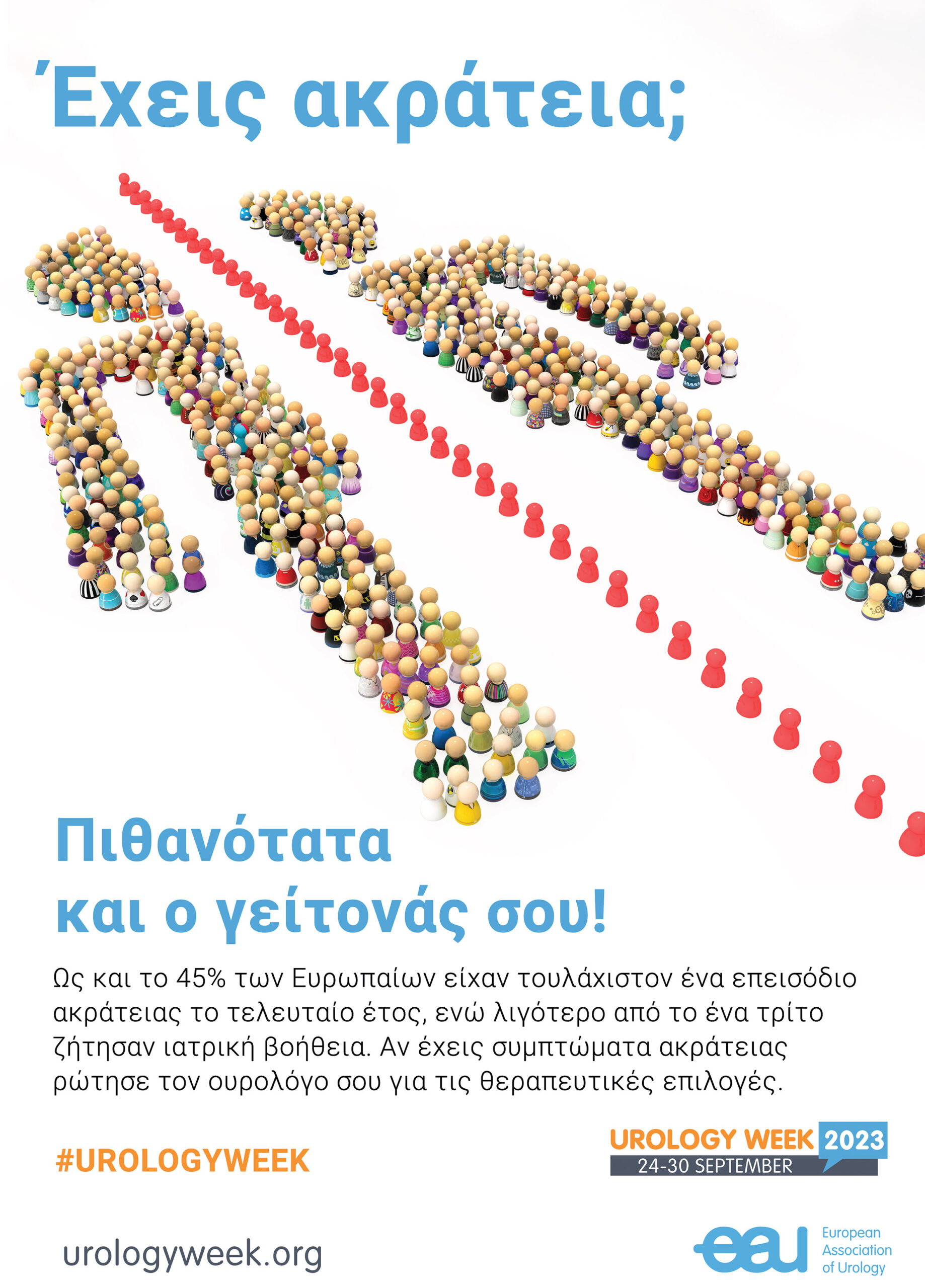 H Ελληνική Ουρολογική Εταιρεία (Ε.Ο.Ε), στο πλαίσιο της φετινής Ευρωπαϊκής Εβδομάδας Ουρολογικών Παθήσεων “Urology Week” (24-30 Σεπτεμβρίου 2023), η οποία είναι αφιερωμένη στην ακράτεια ούρων, επιδιώκει να ενημερώσει τους επαγγελματίες υγείας που έχουν ιδιαίτερο ενδιαφέρον και αντιμετωπίζουν άτομα με τη συγκεκριμένη διαταραχή, σχετικά με τις παραμέτρους της εν λόγω κατάστασης. Επιπλέον επιδιώκει να δώσει στους πάσχοντες και το οικείο τους περιβάλλον, τις απαραίτητες βασικές γνώσεις προκειμένου να αποκτήσουν την εμπιστοσύνη στις δομές υγείας, η οποία θα τους επιτρέψει να αναζητήσουν βοήθεια και να βελτιώσουν την ποιότητα ζωής τους.
