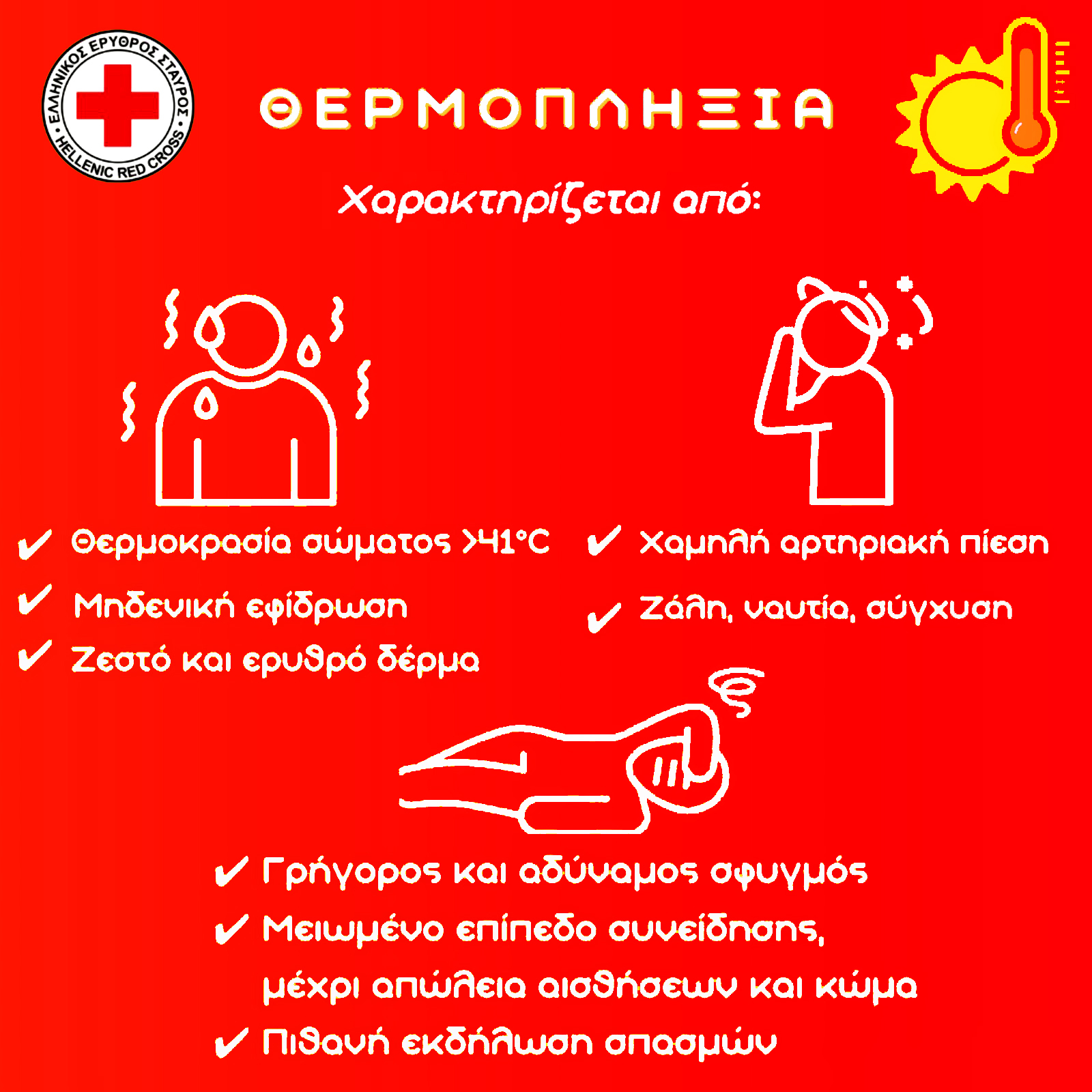 Με τον υδράργυρο να χτυπάει κόκκινο αυτές τις μέρες και το κύμα καύσωνα να είναι αισθητό σε όλες τις περιοχές της Ελλάδας, ο Ελληνικός Ερυθρός Σταυρός (Ε.Ε.Σ), προτείνει χρήσιμες οδηγίες για την αναγνώριση των συμπτωμάτων της θερμοπληξίας, αλλά και οδηγίες για την ορθή αντιμετώπισής της.