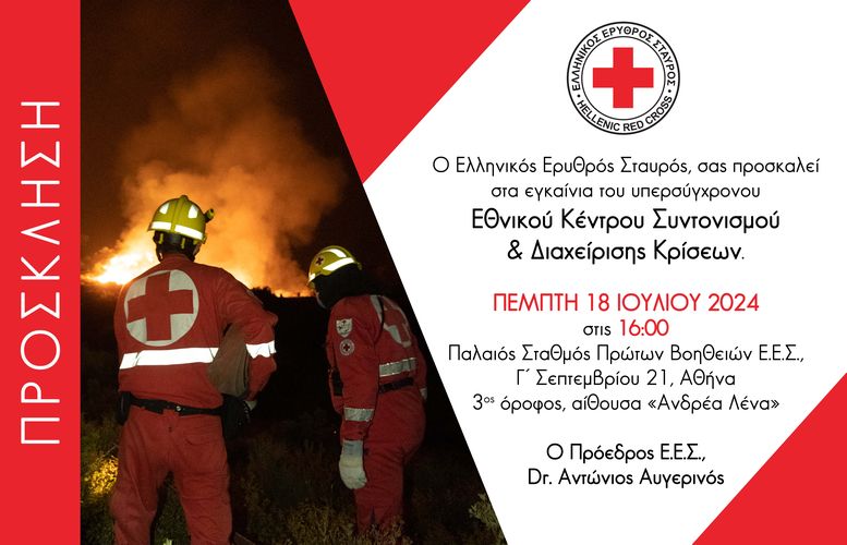 Ο Ελληνικός Ερυθρός Σταυρός (Ε.Ε.Σ.), την Πέμπτη 18 Ιουλίου και ώρα 4 μ.μ., εγκαινιάζει το υπερσύγχρονο Εθνικό Κέντρο Συντονισμού και Διαχείρισης Κρίσεων του Ε.Ε.Σ.,  το οποίο στεγάζεται στο ιστορικό κτήριο του Ε.Ε.Σ. στην 3ης Σεπτεμβρίου (αριθμός 21). Ένα αποφασιστικό βήμα για την ενίσχυση της ικανότητας του Ε.Ε.Σ. να ανταποκρίνεται άμεσα και αποτελεσματικά σε καταστάσεις έκτακτης ανάγκης (πυρκαγιές, πλημμύρες, σεισμοί κ.α.), καθώς είναι εξοπλισμένο με σύγχρονες υποδομές και τεχνολογίες αιχμής.
