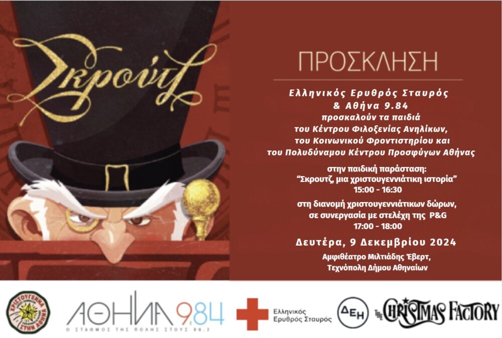 Συγκεκριμένα, τα παιδιά που υποστηρίζονται από το Κέντρο Φιλοξενιάς Ανηλίκων (ΚΦΑΑ), το Κοινωνικό Φροντιστήριο και το Πολυδύναμο Κέντρο Προσφύγων Αθήνας του Τομέα Κοινωνικής Πρόνοιας του Ελληνικού Ερυθρού Σταυρού θα βιώσουν το πνεύμα των Χριστουγέννων στο ΔΕΗ Christmas Factory, καθώς και μέσα από την παιδική παράσταση «Σκρουτζ, μια χριστουγεννιάτικη ιστορία», τη διαχρονική χριστουγεννιάτικη ιστορία του Κάρολου Ντίκενς, από 11μελή θίασο.