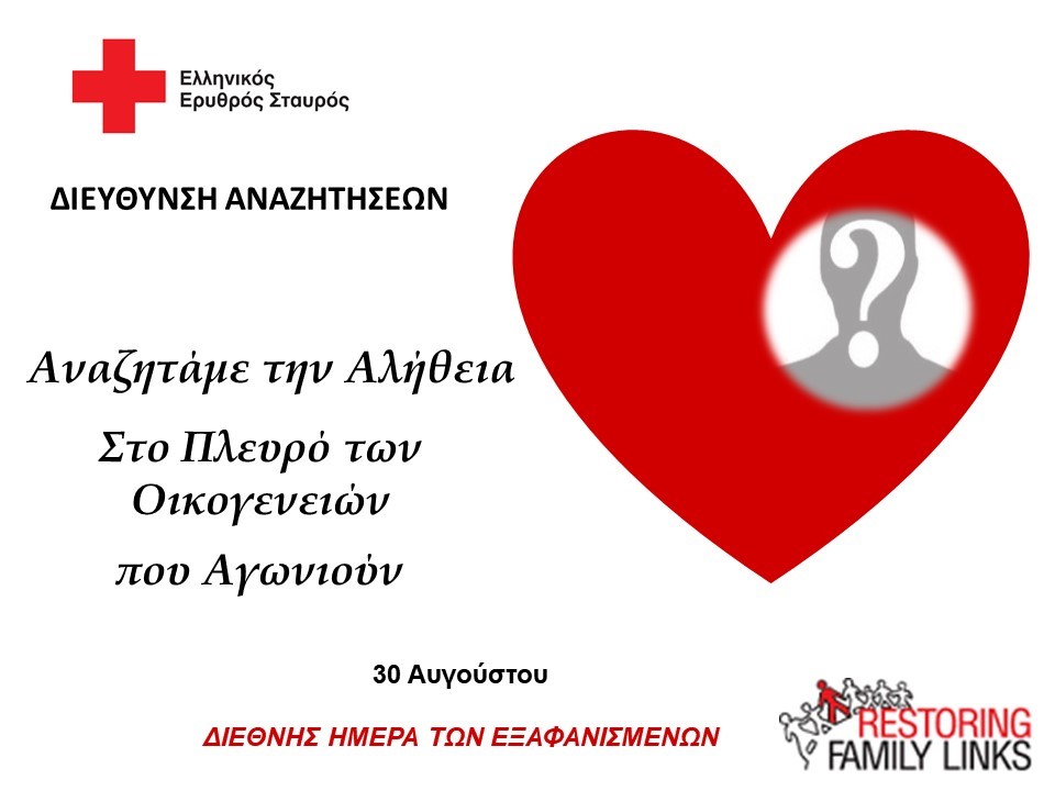 Για τον Ελληνικό Ερυθρό Σταυρό η συγκεκριμένη μέρα αποτελεί μια σημαντική υπενθύμιση στη διεθνή κοινότητα, των υποχρεώσεων της απέναντι στις οικογένειες και στο παναθρώπινο δικαίωμά τους να γνωρίζουν την τύχη των μελών τους. Η δέσμευση του Ε.Ε.Σ. και προσωπικά του Προέδρου, Dr. Αντωνίου  Αυγερινού, είναι αληθής και δεδομένη. Ολόκληρος ο Οργανισμός ενώνει τις δυνάμεις του, και με διακριτικότητα και αλληλεγγύη, θα συνεχίσει να αποτελεί το στήριγμα των οικογενειών που αναζητούν εξαφανισμένους αγαπημένους τους.