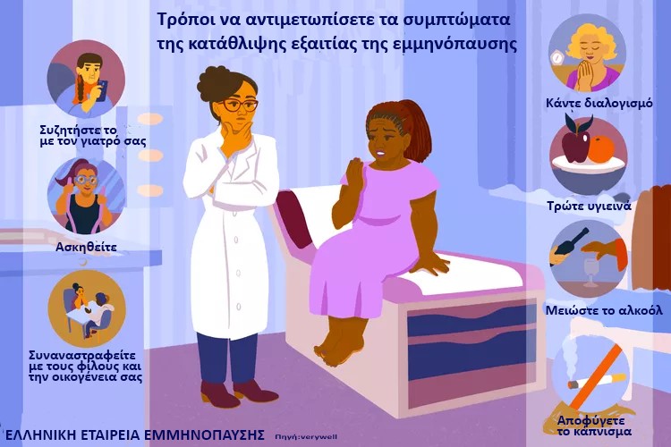 Η αντιμετώπιση των συμπτωμάτων της κατάθλιψης που συνοδεύουν την περιεμμηνόπαυση ή την εμμηνόπαυση απαιτεί συχνά συστηματική προσέγγιση. Και όπως πολλές άλλες συστάσεις για την κατάθλιψη ή την εμμηνόπαυση, οι αλλαγές στον τρόπο ζωής μπορούν να κάνουν σημαντική διαφορά στην ποιότητα της ζωής σας. Η καθημερινή άσκηση, η κοινωνι- κοποίηση με τους φίλους και την οικογένεια, ο διαλογισμός (mindfulness), η επίγνωση και η συμμετοχή σε δραστηριότητες που ήταν ευχάριστες πριν ξεκινήσουν τα καταθλιπτικά επεισόδια είναι μόνο μερικοί τρόποι αντιμετώπισης των συμπτωμάτων που σχετίζονται με την κατάθλιψη, τονίζει ο κος Παπαδόπουλος.