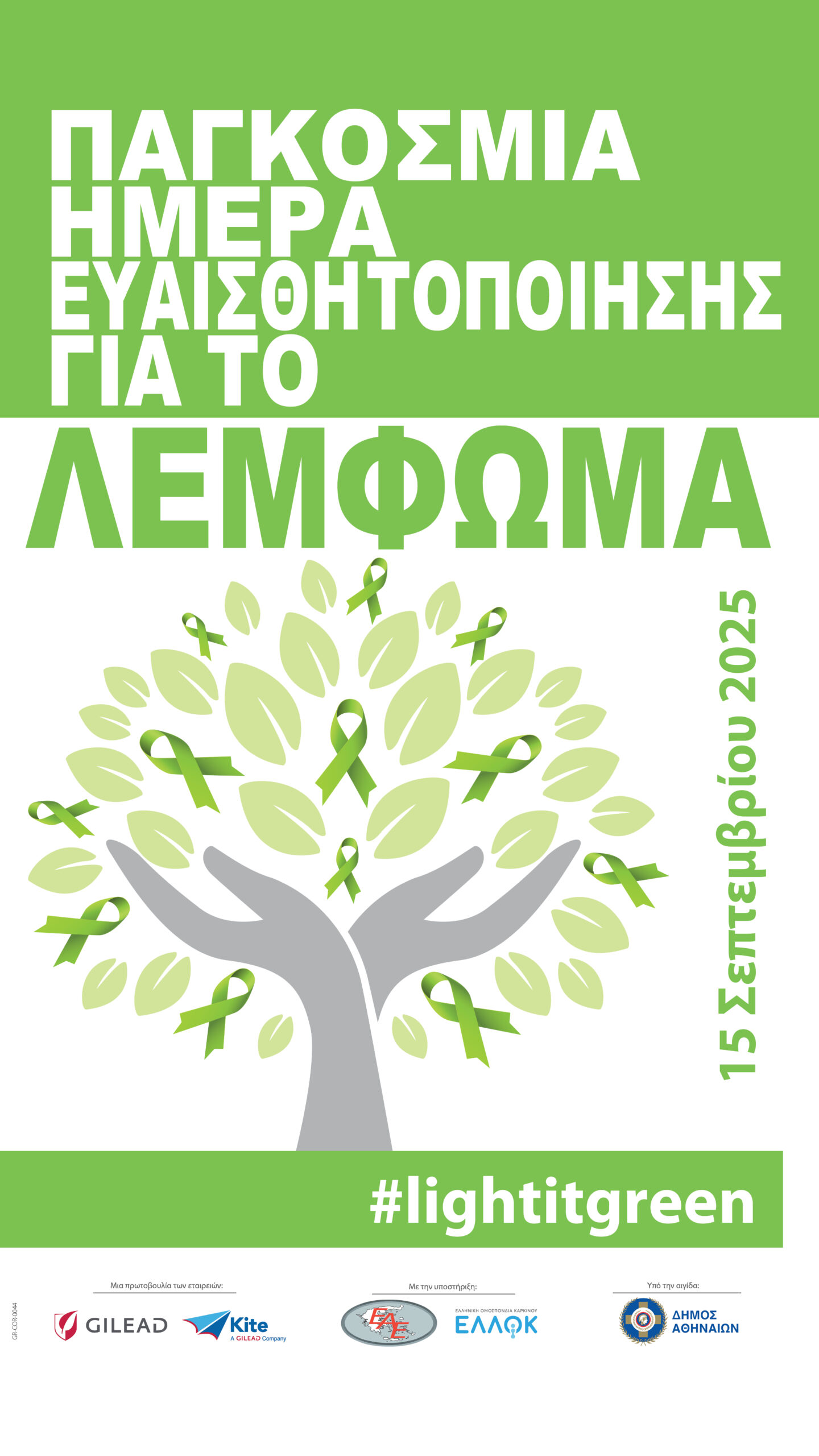 Με αφορμή την Παγκόσμια Ημέρα Ευαισθητοποίησης για το Λέμφωμα, η Gilead Sciences, σε συνεργασία με την Ελληνική Αιματολογική Εταιρεία και την Ελληνική Ομοσπονδία Καρκίνου (ΕΛΛΟΚ), και με την αιγίδα του Δήμου Αθηναίων, υλοποιεί για μία ακόμη χρονιά την εκστρατεία ενημέρωσης και ευαισθητοποίησης «Light It Green».