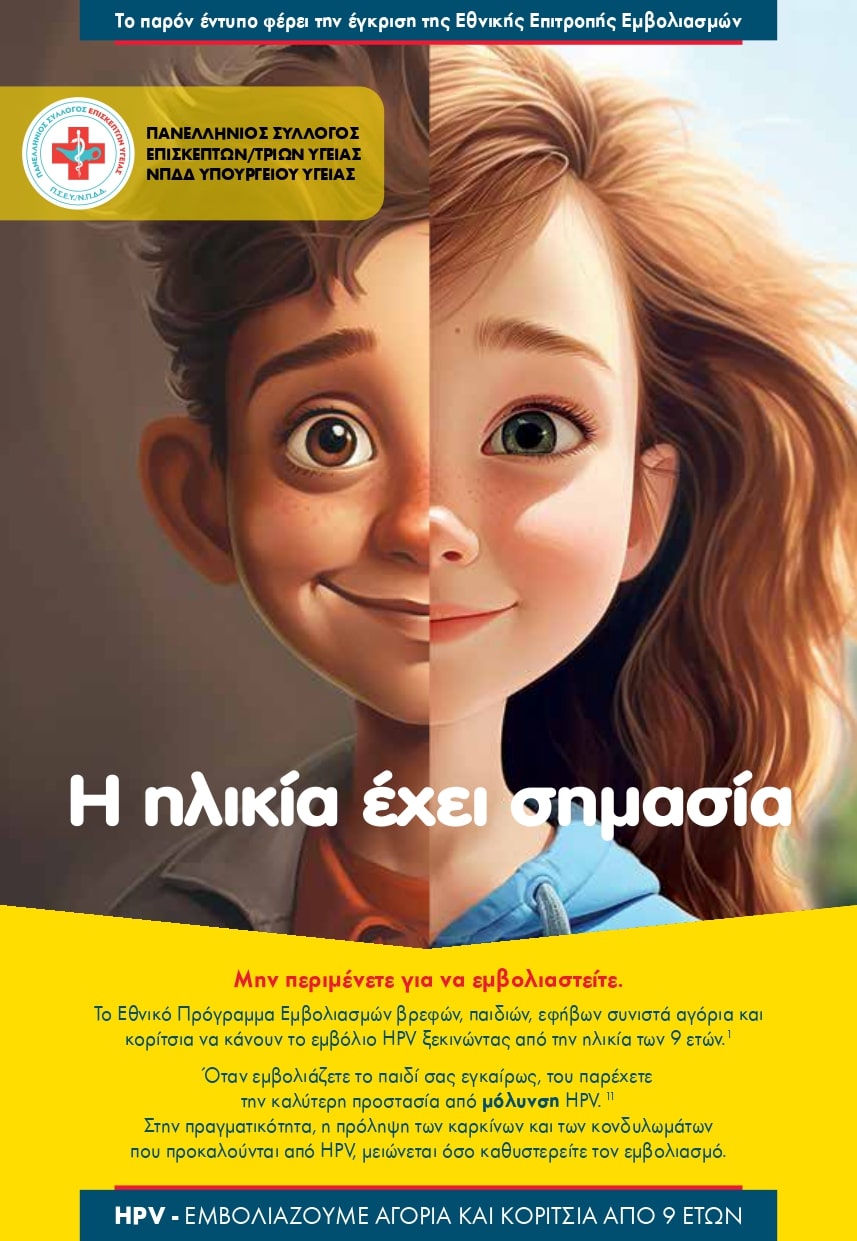 - σε αγόρια και κορίτσια ηλικίας 9-11 ετών, Σε περίπτωση που ο εμβολιασμός δεν γίνει στη συνιστώμενη ηλικία, μπορεί να γίνει αναπλήρωση έως την ηλικία των 18 ετών. Επισημαίνεται ότι το εμβόλιο HPV αποζημιώνεται πλήρως σε αγόρια και κορίτσια ηλικίας 15-18 ετών μέχρι 31.12.2025 .