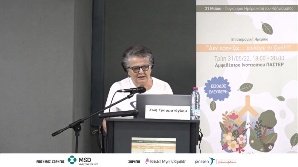 Τη σειρά των ομιλιών ολοκλήρωσε η κυρία Ζένια Σαριδάκη-Ζώρα, Παθολόγος Ογκολόγος, η οποία συμμετείχε με μαγνητοσκοπημένη ομιλία με θέμα  «Κάπνισμα, καρκίνος του πνεύμονα και γυναίκα». Η κυρία Σαριδάκη ανέφερε ότι τα ποσοστά ανδρών καπνιστών μειώνονται αλλά τα ποσοστά καπνίσματος των γυναικών αυξάνονται. Το κάπνισμα αποτελεί σε ποσοστό 87% προδιαθεσικό παράγοντα για τον καρκίνο του πνεύμονα, ενώ άλλοι παράγοντες είναι η ατμοσφαιρική ρύπανση, η έκθεση σε ακτινοβολία, η επαγγελματική έκθεση σε αμίαντο, αρσενικό, χρώμιο, ραδόνιο, νικέλιο, προϊόντα καύσης του άνθρακα, πίσσες και ορυκτέλαια, οι χρόνιες πνευμονοπάθειες και η κληρονομικότητα. Εκτός από το ενεργό και το παθητικό κάπνισμα, σωρευτικά επιβαρύνει τον οργανισμό και το τριτογενές κάπνισμα: το αόρατο τοξικό μείγμα αερίων και μορίων που επικάθεται στα μαλλιά και στα ρούχα των καπνιστών, αλλά και στα έπιπλα και στο πάτωμα. Το μείγμα αυτό παραμένει εκεί αφότου ο χώρος έχει καθαριστεί από τον καπνό. Στα κατάλοιπα περιλαμβάνονται βαρέα μέταλλα, καρκινογόνα, ακόμα και ραδιενεργά υλικά.