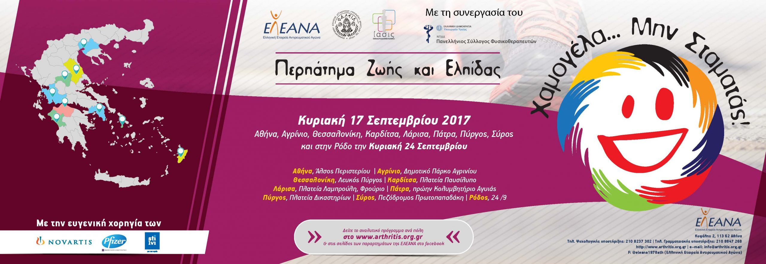 Η Ελληνική Εταιρεία Αντιρευματικού Αγώνα (ΕΛ.Ε.ΑΝ.Α.), ο Δωδεκανησιακός Σύλλογος Αυτοάνοσων Νοσημάτων Αρθρίτιδας και Λύκου «ΘΑΛΕΙΑ» και ο Σύλλογος Ρευματοπαθών και Φίλων Κυκλάδων «ΙΑΣΙΣ» με τη συνεργασία με τον Πανελλήνιο Σύλλογο Φυσικοθεραπευτών  διοργανώνουν και φέτος το «Περπάτημα Ζωής και Ελπίδας», το οποίο θα διεξαχθεί την Κυριακή, 17 Σεπτεμβρίου 2017, σε Αθήνα, Αγρίνιο, Θεσσαλονίκη, Καρδίτσα, Λάρισα, Πάτρα, Πύργο και Σύρο και στις 24 Σεπτεμβρίου στη Ρόδο.