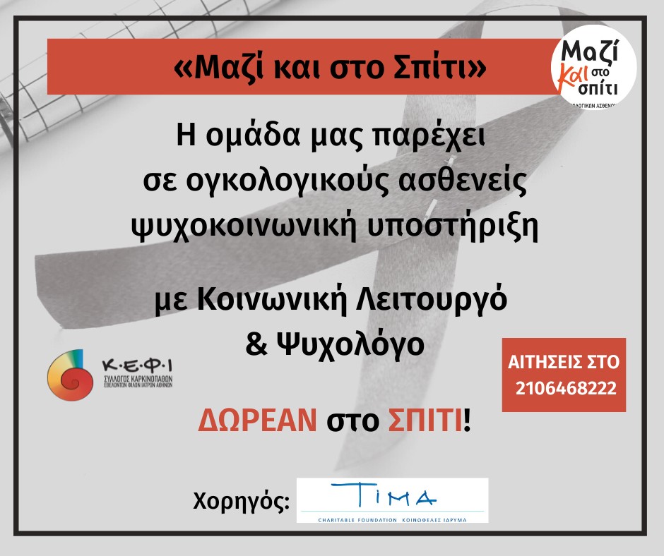 Το πρόγραμμα Μαζί και στο Σπίτι, αποτελεί την υλοποίηση του οράματος για την βελτίωση της ποιότητας ζωής των ογκολογικών ασθενών και των οικογενειών τους που δεν είναι σε θέση να μετακινηθούν από το σπίτι τους.