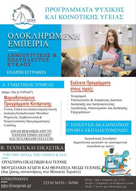 Τα Προγράμματα Ψυχικής Υγείας του Πανεπιστήμιου Αιγαίου ανακοινώνουν την έναρξη εγγραφών στον πιο δημιουργικό και πολύπλευρο κύκλο κατάρτισης που έχει προσφερθεί από ελληνικό πανεπιστήμιο.