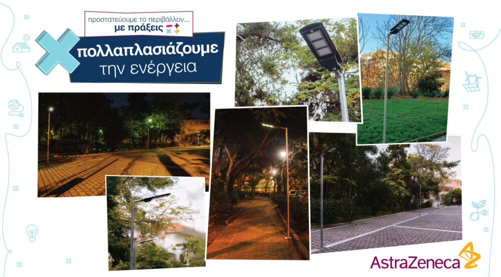 Η AstraZeneca ανανέωσε και φέτος τη δέσμευσή της να συμβάλει στη δημιουργία ενός υγιέστερου μέλλοντος για τον πλανήτη και τον άνθρωπο, ολοκληρώνοντας με επιτυχία την τρίτη φάση του εταιρικού προγράμματος «Προστατεύουμε το περιβάλλον…με πράξεις». Με κεντρικό μήνυμα «Πολλαπλασιάζουμε την ενέργεια!» η εταιρεία υποστήριξε δράση ενίσχυσης του φωτισμού με ηλιακή ενέργεια τριών πάρκων στην Αθήνα και ενός πάρκου στη Θεσσαλονίκη. Η δράση υλοποιήθηκε σε συνεργασία με τον Δήμο Αθηναίων και τον Δήμο Θεσσαλονίκης και περιελάμβανε την ταυτόχρονη τοποθέτηση συνολικά 20 ηλιακών κολώνων νέας τεχνολογίας LED.