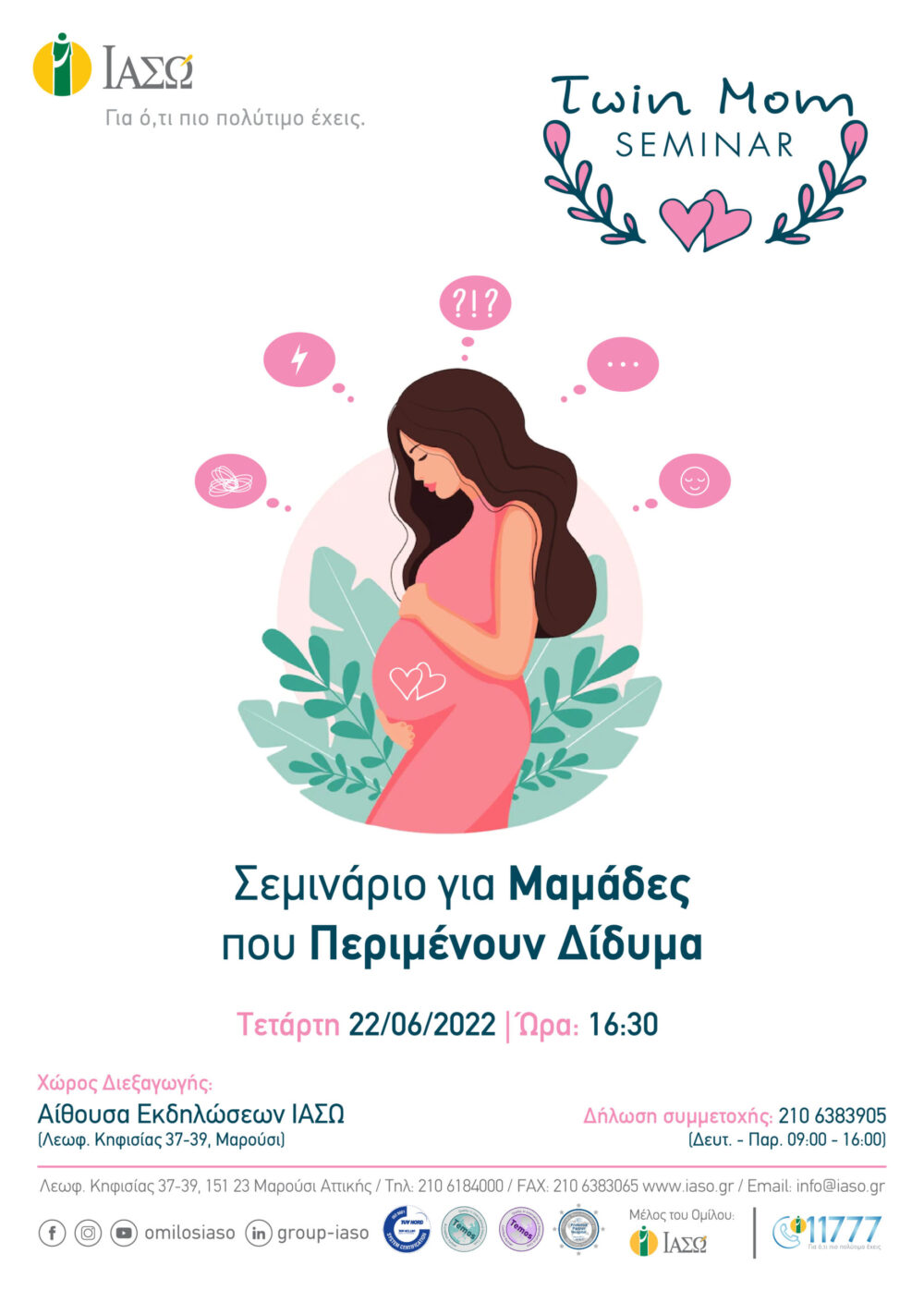 Το ΙΑΣΩ, διοργανώνει το Twin Mom Seminar, ένα πρωτοποριακό σεμινάριο το οποίο  απευθύνεται σε γυναίκες που κυοφορούν δίδυμα. Το σεμινάριο θα πραγματοποιηθεί την Τετάρτη 22 Ιουνίου 2022, στις 16:30 στη Αίθουσα Εκδηλώσεων του ΙΑΣΩ (Λεωφ. Κηφισίας 37 – 39, Μαρούσι).