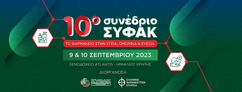 Ο Συνεταιρισμός Φαρμακοποιών Αιγαίου & Κρήτης (ΣΥ.Φ.Α.Κ.) και η Ελληνική Φαρμακευτική Εταιρεία (Ε.Φ.Ε.) διοργανώνουν για 10η συνεχή χρονιά το Συνέδριο του ΣΥΦΑΚ «Το Φαρμακείο στην Υγεία, Ομορφιά & Ευεξία», στις 9 και 10 Σεπτεμβρίου 2023, στο ξενοδοχείο Atlantis, στο Ηράκλειο της Κρήτης.