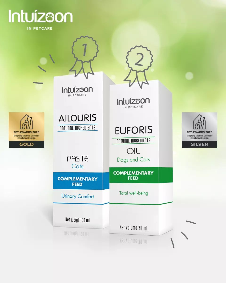Συγκεκριμένα, οι διακρίσεις αφορούν το φυσικό συμπλήρωμα Intuizoon in Petcare AILOURIS, το οποίο τιμήθηκε με το χρυσό βραβείο στην κατηγορία «Καλύτερο συμπλήρωμα για γάτες», για την φυσιολογική χαλάρωση σε περίπτωση δυσουρικών ενοχλήσεων σε γάτες, και το φυσικό συμπλήρωμα Intuizoon in Petcare EUFORIS, το οποίο τιμήθηκε με το ασημένιο βραβείο στην κατηγορία «Καλύτερο συμπλήρωμα για σκύλους», για την επαναφορά της συναισθηματικής και φυσικής ευεξίας των κατοικίδιων.