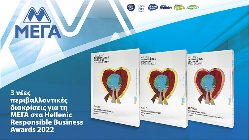 Τρεις νέες σημαντικές περιβαλλοντικές διακρίσεις παρέλαβε η 100% ελληνική εταιρεία ΜΕΓΑ Προϊόντα Ατομικής Υγιεινής Α.Ε., στην έβδομη τελετή απονομής των φετινών στα Hellenic Responsible  Business Awards 2022, τον μεγάλο θεσμό που επιβραβεύει  την Υπεύθυνη Επιχειρηματικότητα και τη Βιώσιμη Ανάπτυξη.